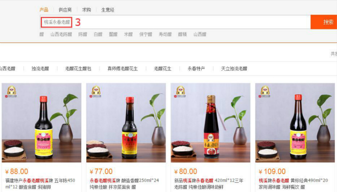 - 在搜索框中輸入“桃溪永春老醋”,從跳出的產(chǎn)品中點(diǎn)擊進(jìn)入!