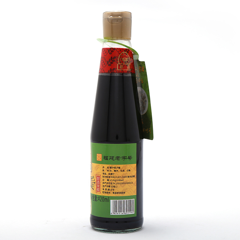 選用陳釀多年的永春老醋(液態(tài)發(fā)酵,純糧釀造),輔以精心秘制的生姜汁佳釀?wù){(diào)制而成。酸度5.0,其姜香撲鼻,入味醇香,酸而不澀,而且無需添加劑和防腐劑。具有酸、香、味、鮮、色的特點(diǎn),非常適合蘸食餃子,增香助味;也可用于火鍋、涼拌、燒烤調(diào)味等。